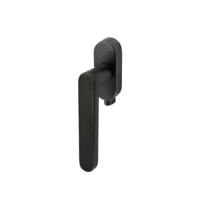 De raamkruk op ovaal rozet is uitgevoerd in antraciet mat titaan PVD en heeft een mat uiterlijk door de geborstelde behandeling.