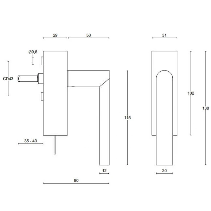 Lengte kruk 115mm. Dikte kruk 12mm. Afmeting kast 102x31mm.