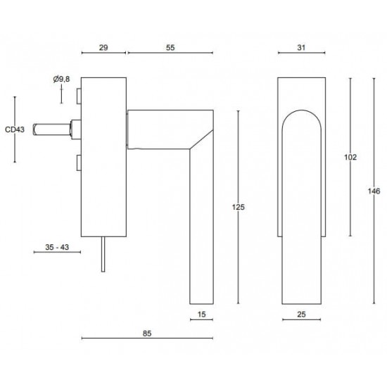 Lengte kruk 125mm. Dikte kruk 15mm. Afmeting kast 102x31mm.