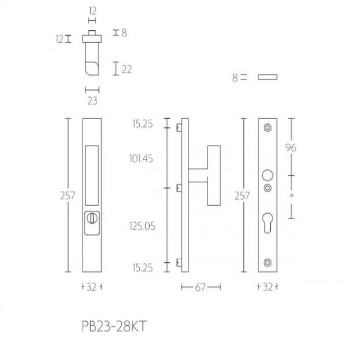 Schild 257x32mmm. U kunt het gewenste type kruk voor de binnenzijde (gatdeel) bijbestellen.